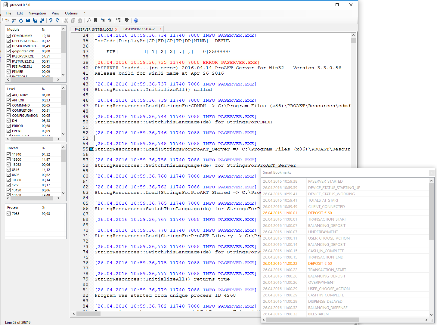 On the right side also there is an additional window for "Smart Bookmarks". When ptraced reads a tracefile, it tries to identify special points of interest (in our example, PASERVER events and transactions) to allow you to quickly navigate between them. You can turn the window on/off with the F7 key or the View/Smart Bookmarks menu.